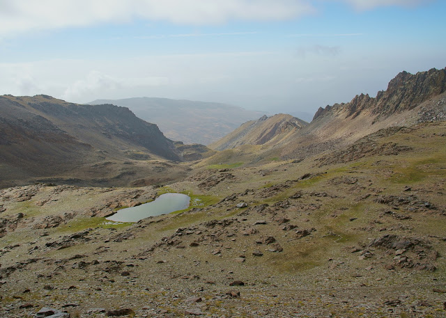 Toca ahora desandar el camino, aunque hicimos una variante. Una buena opción es bajar desde el Collado del Ciervo hasta el Camino de la Estrella, pero teníamos el coche casi 1000 m por encima. Esta ruta permite ver muy bien las caras Norte del Mulhacen y la Alcazaba y pasear por bosques en su parte inferior. Por tanto volvimos prácticamente por la misma ruta. El descenso hasta el refugio de la Caldera se hace más agradable tras conseguir la cima. Nos apartamos algo del camino para asomarnos al Collado del Ciervo.